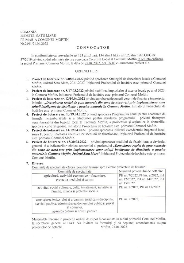 In conformitate cu prevederile art 133 alin.1, art. 134 alin.1 lit.a), alin.2, alin.5 din OUG nr. 57/2019 privind codul administrativ, se convoaca Consiliul Local al Comunei Moftin in sedinta ordinara, in CAMINUL CULTURAL din localitatea Moftinu Mic, la data de 04.04.2022, ora 09,00 cu urmatorul proiect al :