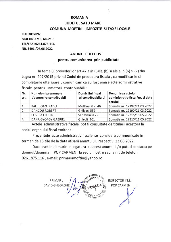 • Pe site -ul www.primariamoftin.ro in data de 06.04.2022