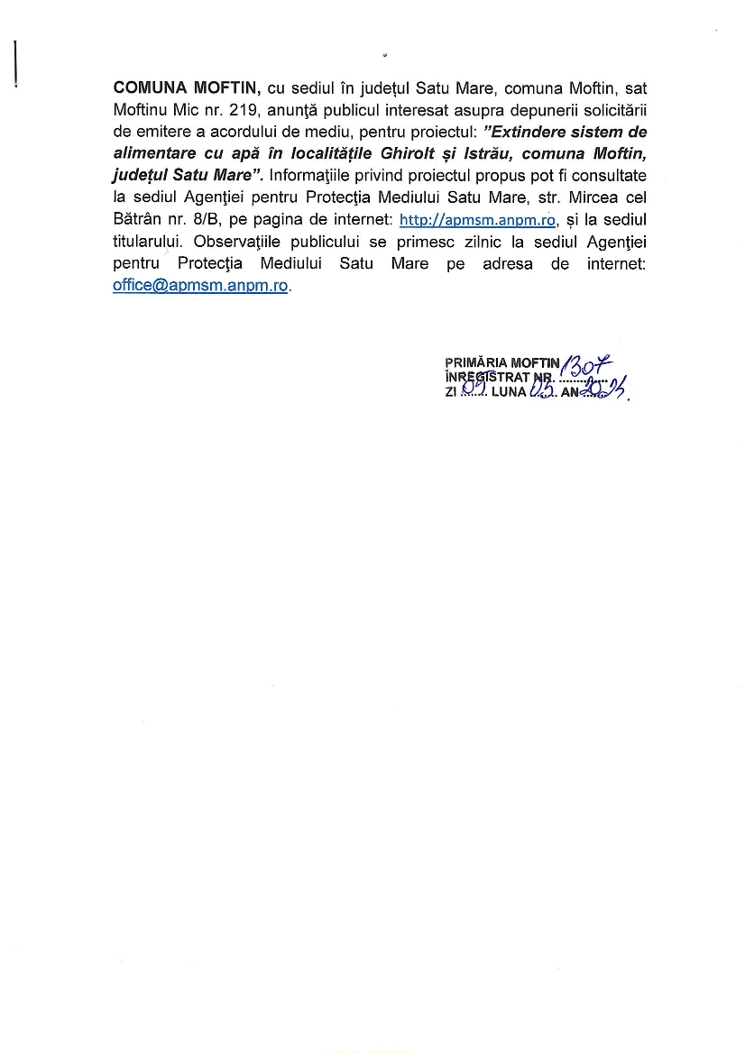 Anunţ asupra depunerii solicitării de emitere a acordului de mediu, pentru proiectul ”Extindere sistem de alimentare cu apă în localitățile Ghirolt și Istrău, comuna Moftin, județul Satu Mare”