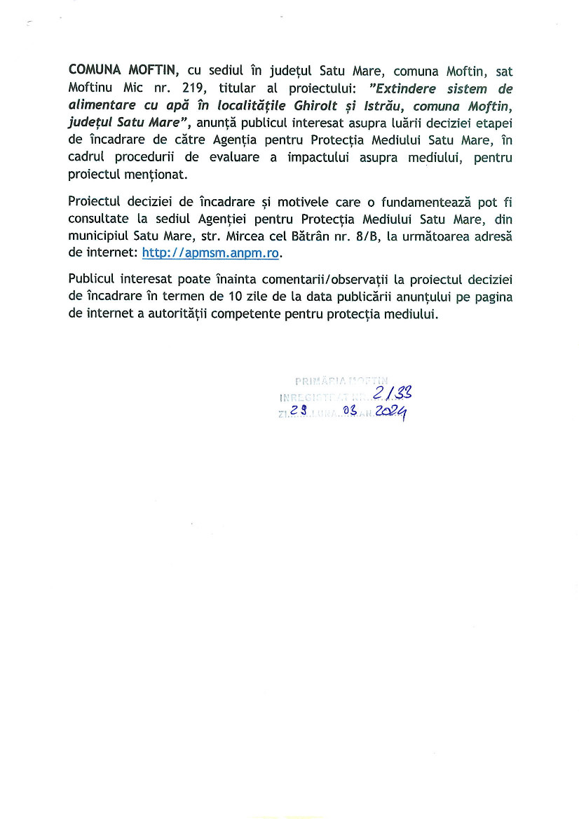 Extindere sistem de alimentare cu apă în localitățile Ghirolt și Istrău, comuna Moftin, județul Satu Mare