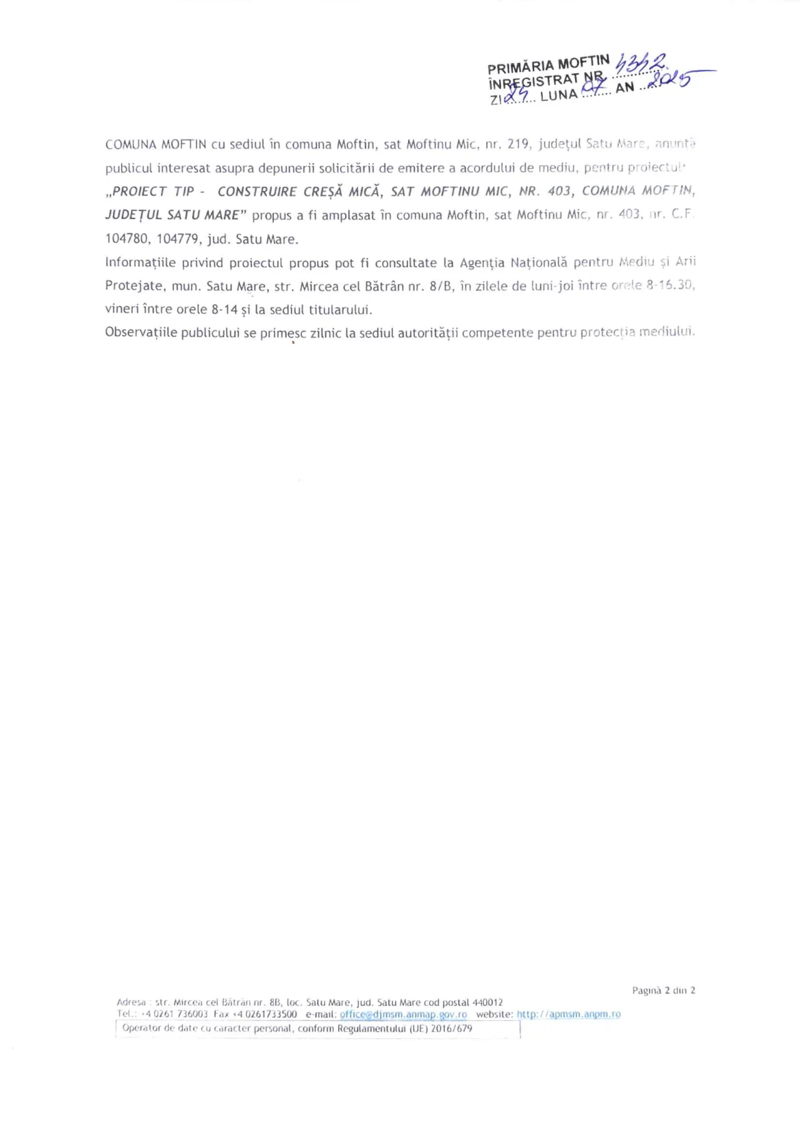 Anunţ asupra depunerii solicitării de emitere a acordului de mediu pentru construire creșă