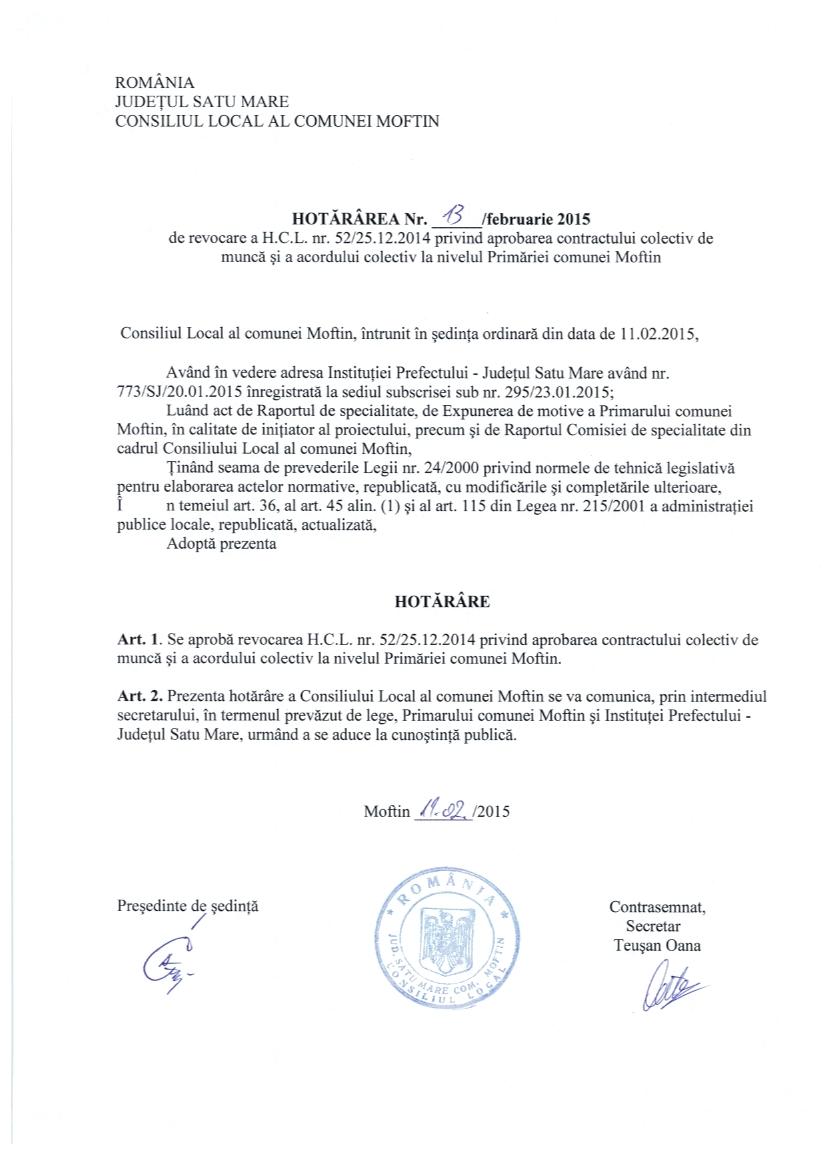 Hot nr 13 privind aprobarea contractului colectiv de munca si a acordului colectiv la Primaria Moftin
