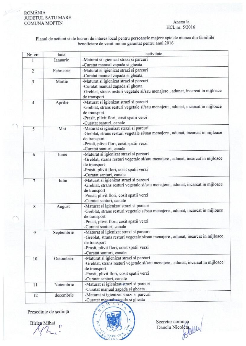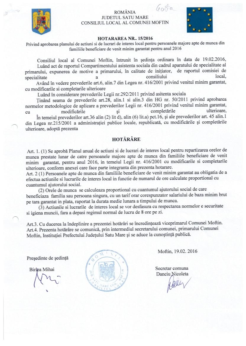 HOT 15 - aprobare plan actiune ptr. persoanele majore apte de munca din fa. beneficiare de venit min garantat