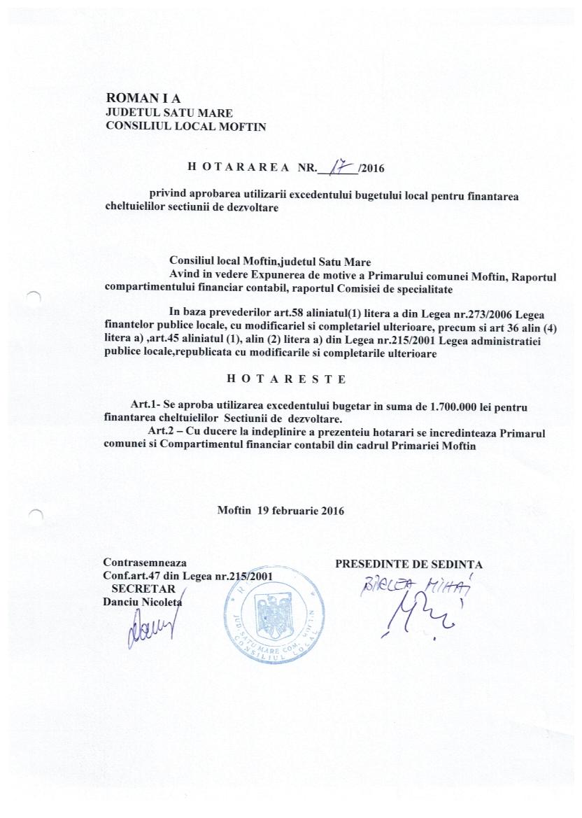 HOT 17 - excedentul bugetar ptr. sectiuni de dezvolatre